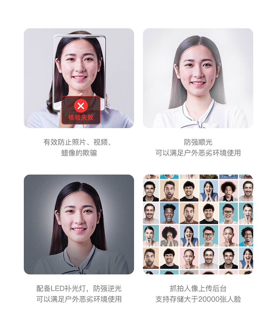 天波智能硬件研发的人脸识别访客终端F10带有红外感应传感器启动,用户可在0.5-1米左右即可实现人脸识别,并采用单目宽动态摄像头,带双补光灯,精准定位抓取生物特征,快速实现刷脸识别,刷脸登记真正做到解放前台的双手,有效防止照片、视频、蜡像的欺骗;支持防强顺光、强逆光,可以满足户外恶劣环境使用。