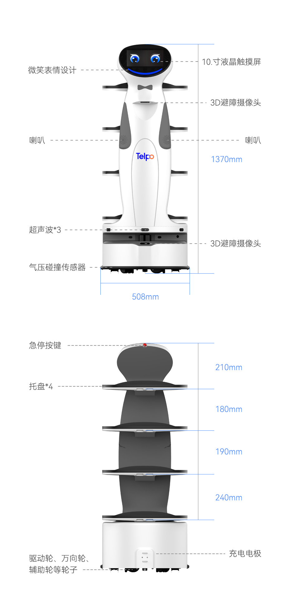 天波为依托成熟的机器人技术结合各类餐饮业需求研发定制企鹅型配送服务机器人AI智能送餐机器人R6,融合多种超声波传感器、底盘俯视3D深度摄像头、上身俯视3D深度摄像头等避障技术,采用四层300°开放角度托盘设计,同时实现多配送任务,能够自主充电,精准定位,配置多个驱动轮,70cm的最小通过间距,窄道通行,自由无阻的在餐厅通行。