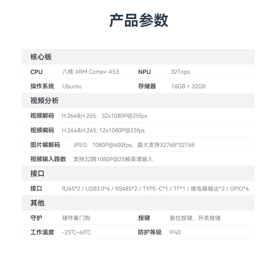 V3边缘视觉ai盒子具备行业领先的32Tops超高算力,支持32路1080P@25fps算法分析。这种高性能计算能力使其能够高效处理大量数据,优化模型效率,适应各种计算需求。